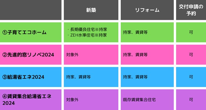 このキャンペーンは、住宅省エネ化を支援する制度であり、以下の表の4つの支援事業の総称です。